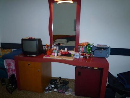 Fernseher/ TischDort auf dem Tisch hatte man die einzige möglichkeit Sonnencreme, Mückenschutz, ect unter zu bringen. Im Bad war kein Platz dafür.