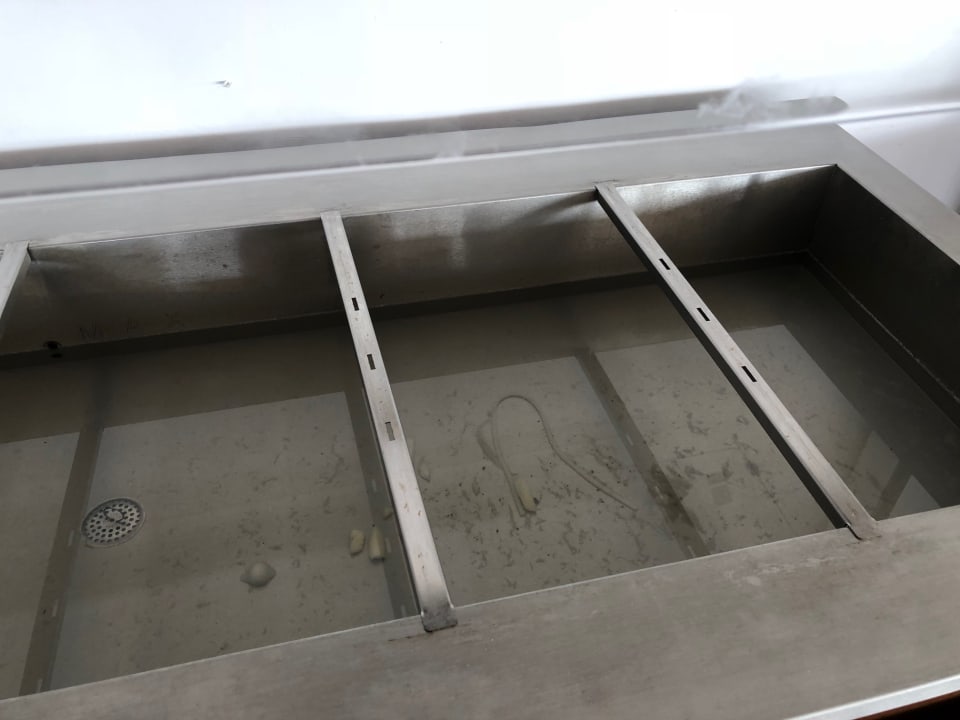 GastroWarmhaltewagen für das Mittagsbuffet, 3 Tage lang lagen hier alte Nudeln und Pommesstückchen im Wasser.