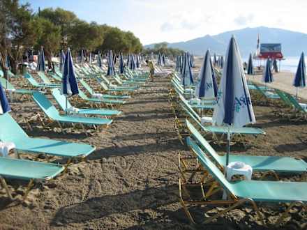 Blick am Strand nach links in Richtung Kalamaki früh morgens