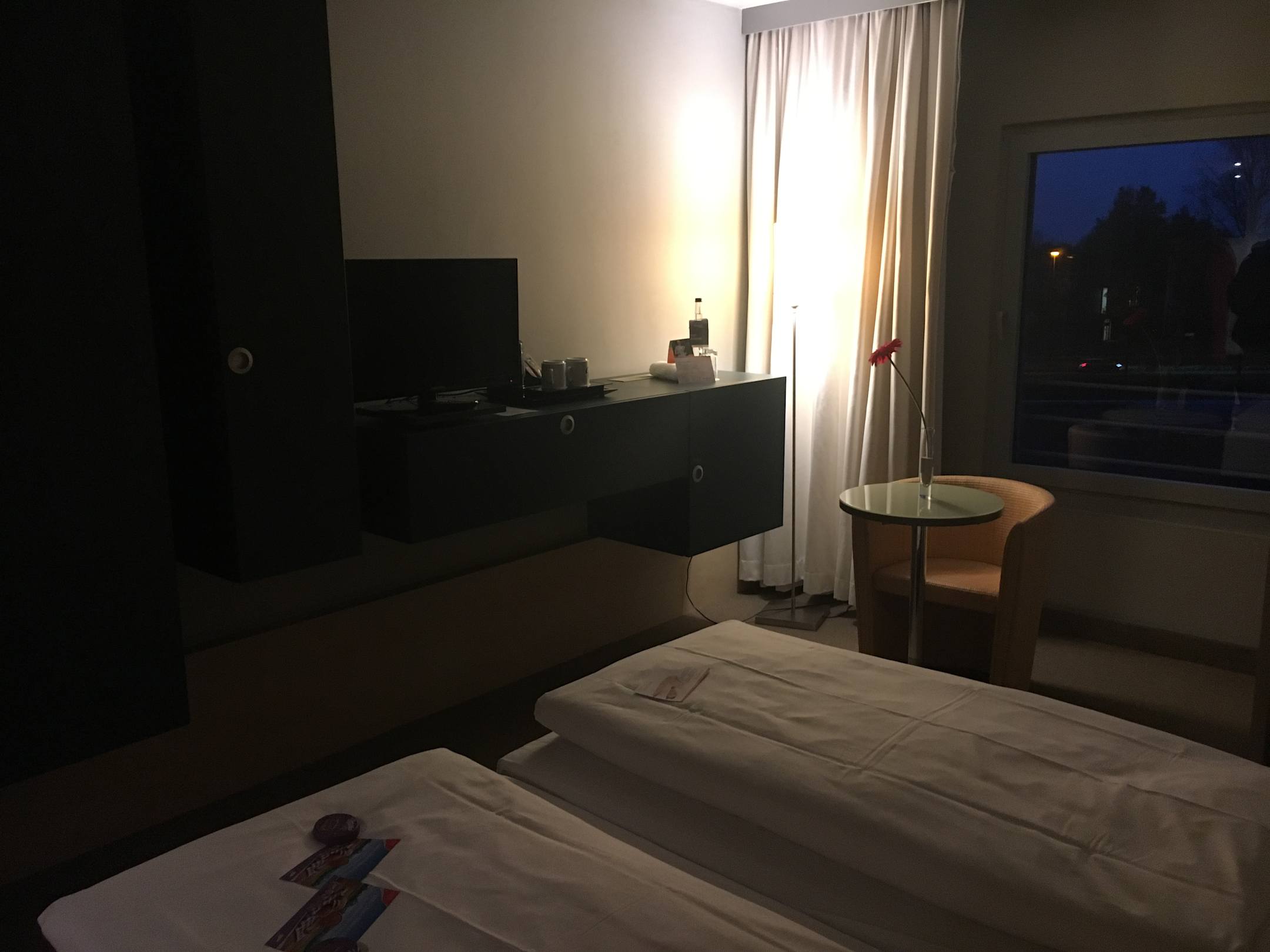 Blick vom Bett auf Schrank und Fernseher
