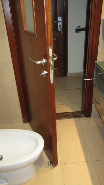 BadezimmertürWäre entweder nur das Bidet, oder auch das danebenstehende WC um einige Zentimeter nach links versetzt (Platz ist vorhanden), könnte die Badezimmertür problemlos 90°geöffnet werden. So aber schlägt man immer wieder unfreiwillig am Türstopper an.