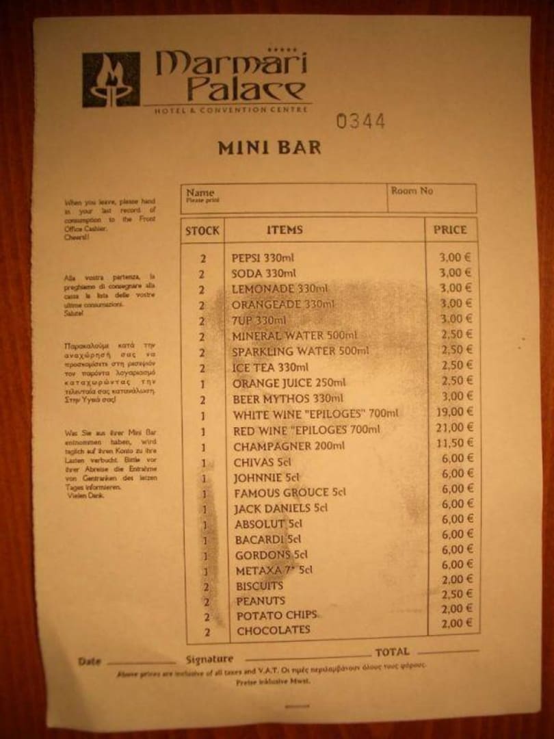 Die Preise für die Getränke in der Minibar: Urteilen Sie selbst... Bei 3.- € für eine DOSE Softdrink oder Bier versorgt man sich doch lieber anderweitig und kühlt das in der Minibar eben mit!