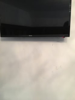 Das hat Flair: Unter dem schräg hängenden Fernseher eine deutlich verdreckte Wand. Mit ein wenig Farbe, Wille und 15min Arbeit wäre das eigentlich erledigt. So sieht das aus wie im Haus der Jugend in Bottrop.