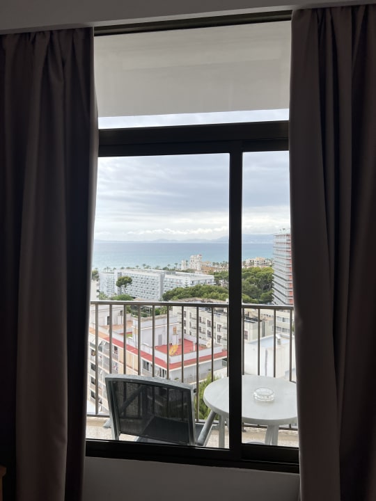 Blick im Zimmrr auf den Balkon und das Meer