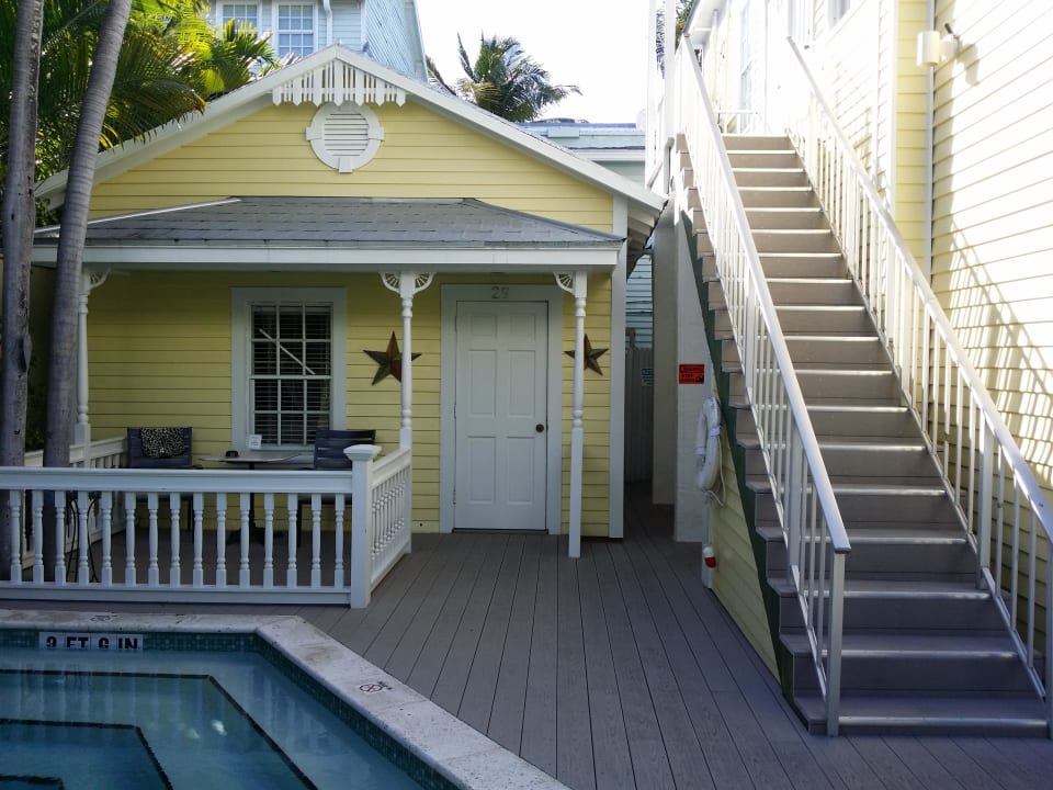 Innenhof mit kleinem Pool und Liegen