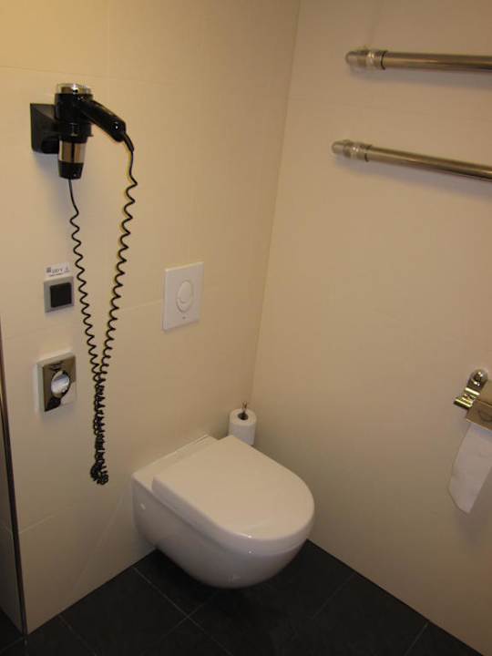 Badezimmer mit Toilette, daneben der Fön