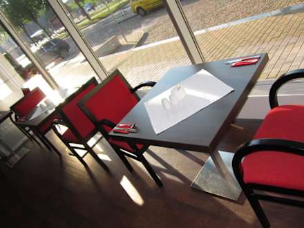 Restaurant/FrühstücksraumEin Platz am großen Panoramafenster. Leider nur mit Ausblick auf den Parkplatz und die Straße.