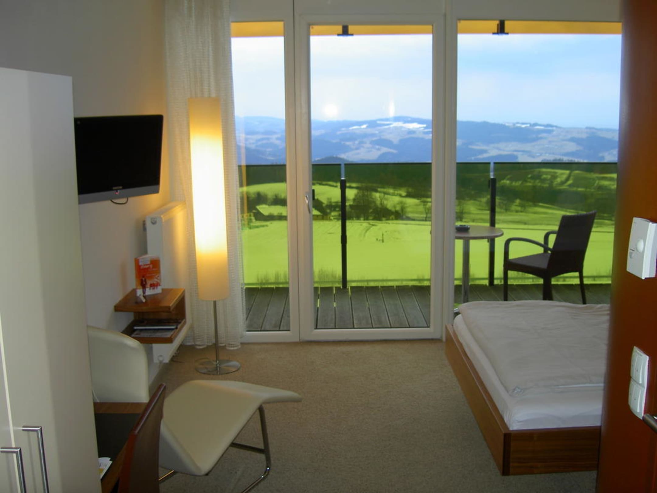 Schönes modernes Zimmer mit Flatscreen, bequemer Liege und tollem Ausblick.