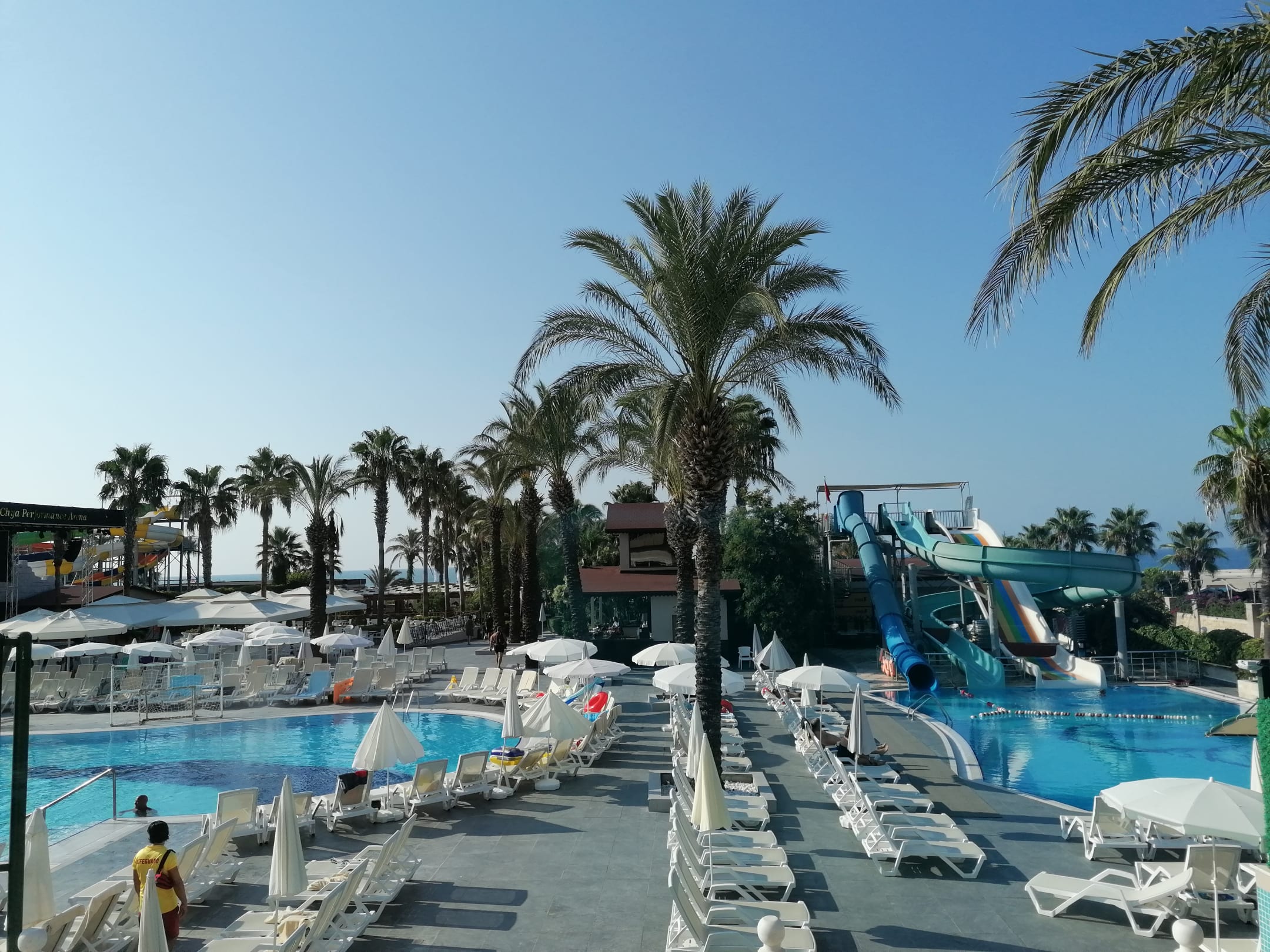 PoolBlick vom Restaurant über Pool und Rutschen. Die Spezialitätenrestaurants sind links hinten kurz vor dem Strand zu erkennen.