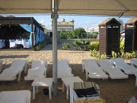 Blick auf die Stranbar, Hotel im Hintergrund