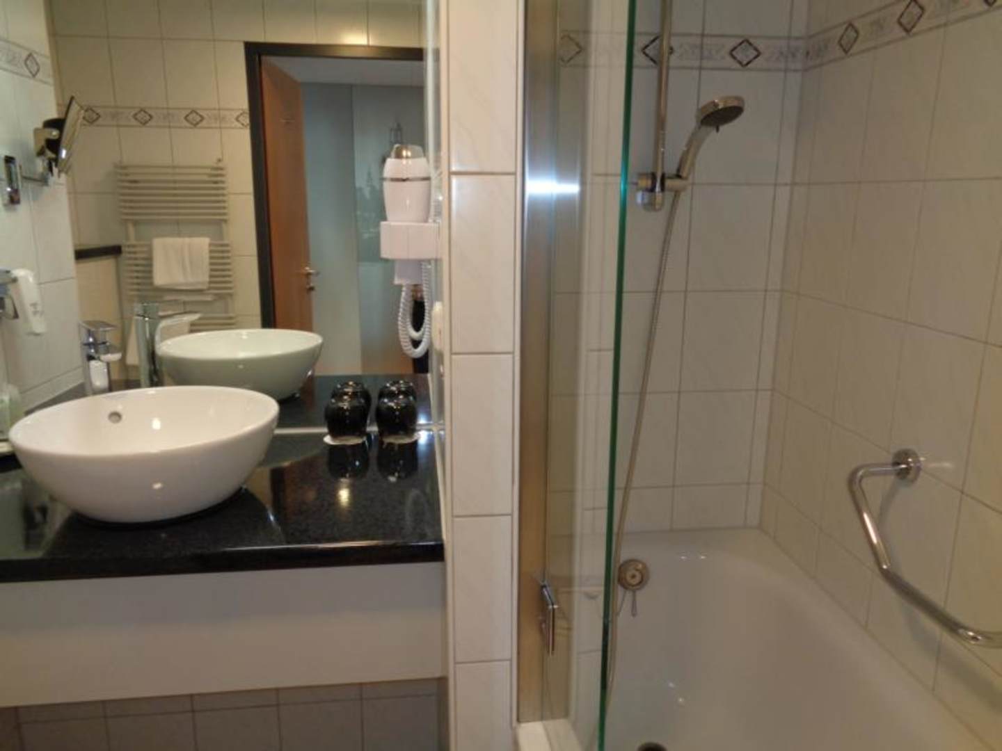 Bad mit Waschbecken, Badewanne und integrierter Dusche.