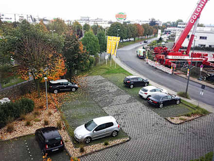 Blick aus dem Zimmer zum Hotelparkplatz