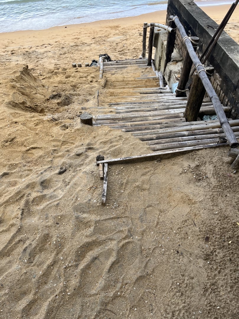 Zugang zum Strand über eine zusammengebastelte Leiter. Das soll Behindertengrecht sein.