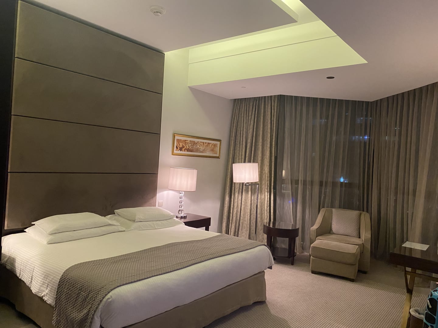 ZimmerZimmer mit Blick Richtung Marina Mall und Meer. Separate Kochnische mit Mikrowelle und Kühlschrank. Waschmaschine. Bademantel und Slipper.