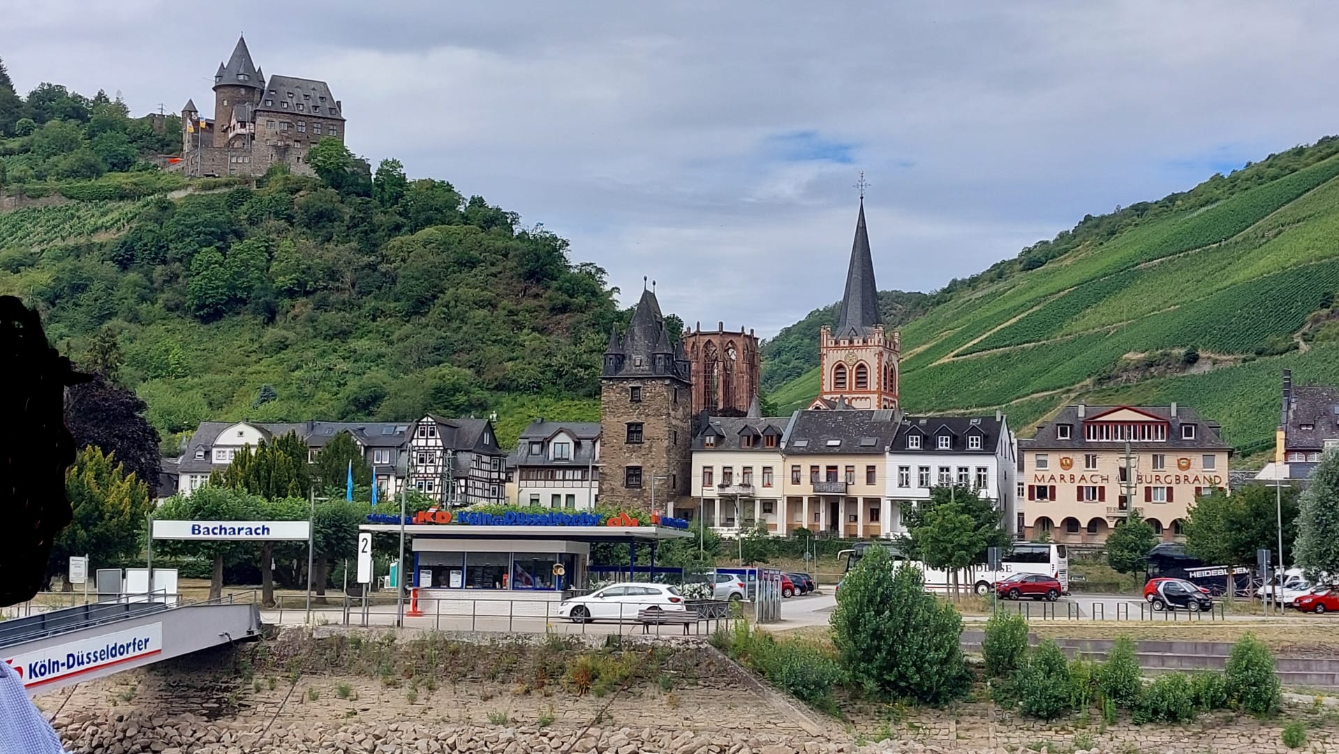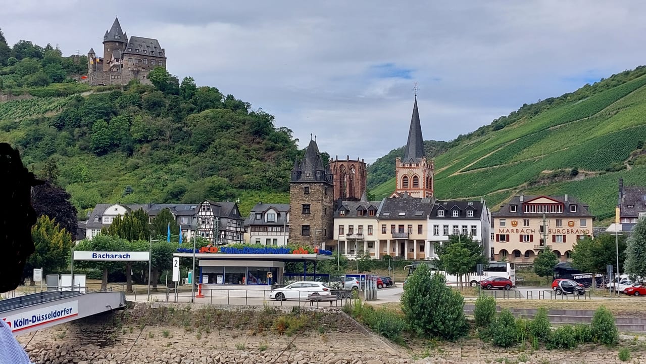 Vom Rheindampfer an der Anlegestelle ist der Bacharacher Hof links vom Stadtmauerturm