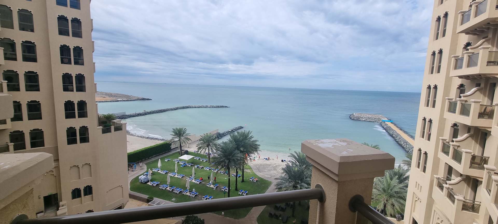 Blick vom 4 Stock auf Pool, Strand und Sportbereich