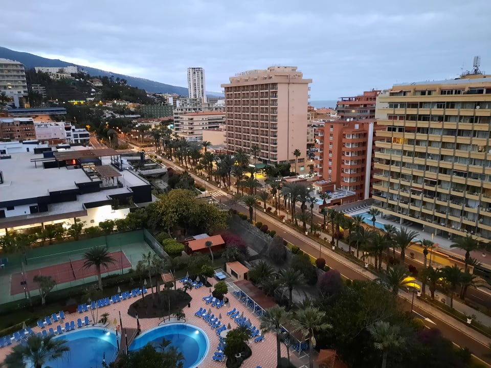 Blick vom Zimmer auf den Pool und Umgebung