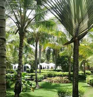 Unterhalb unseres Balkons ( waren im ersten Stock Anlagen Nr. 50207) mit Blick zu den Whirlpools und seinen weißen Baldachinen, rechts davon ist eine kleine Beach Volleyball Anlage, die nur von uns bespielt wurde