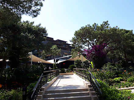 Blick aus dem Garten zum Hotel - rechts die Piano Bar