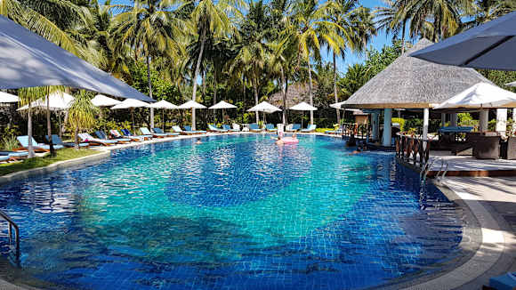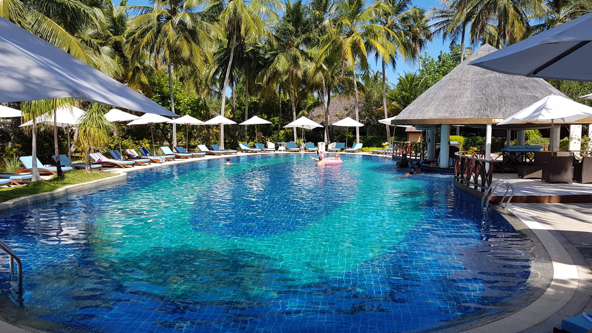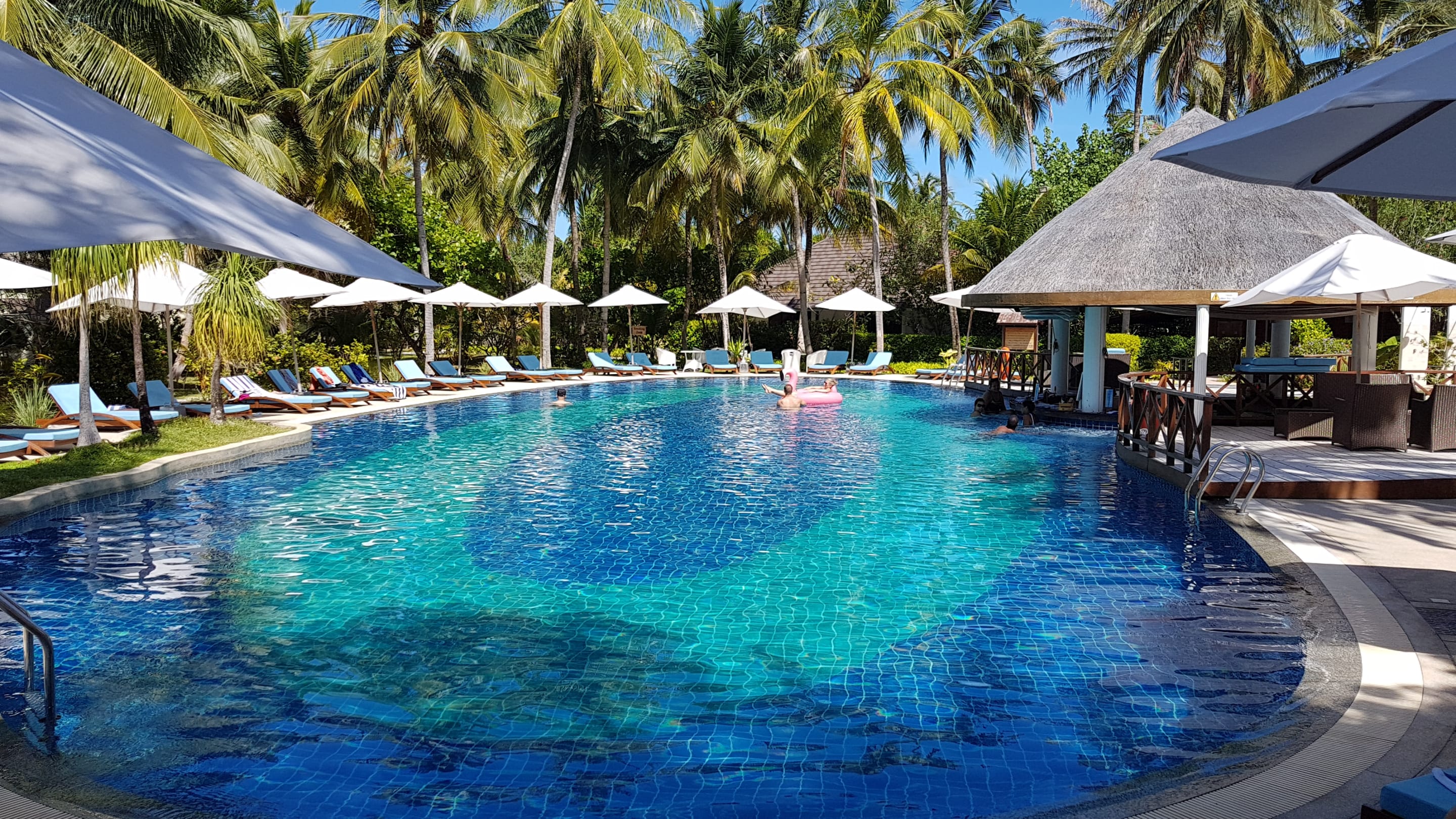 Pool mit Poolbar rechts. Auch im Wasser kann man direkt am Pool sitzen