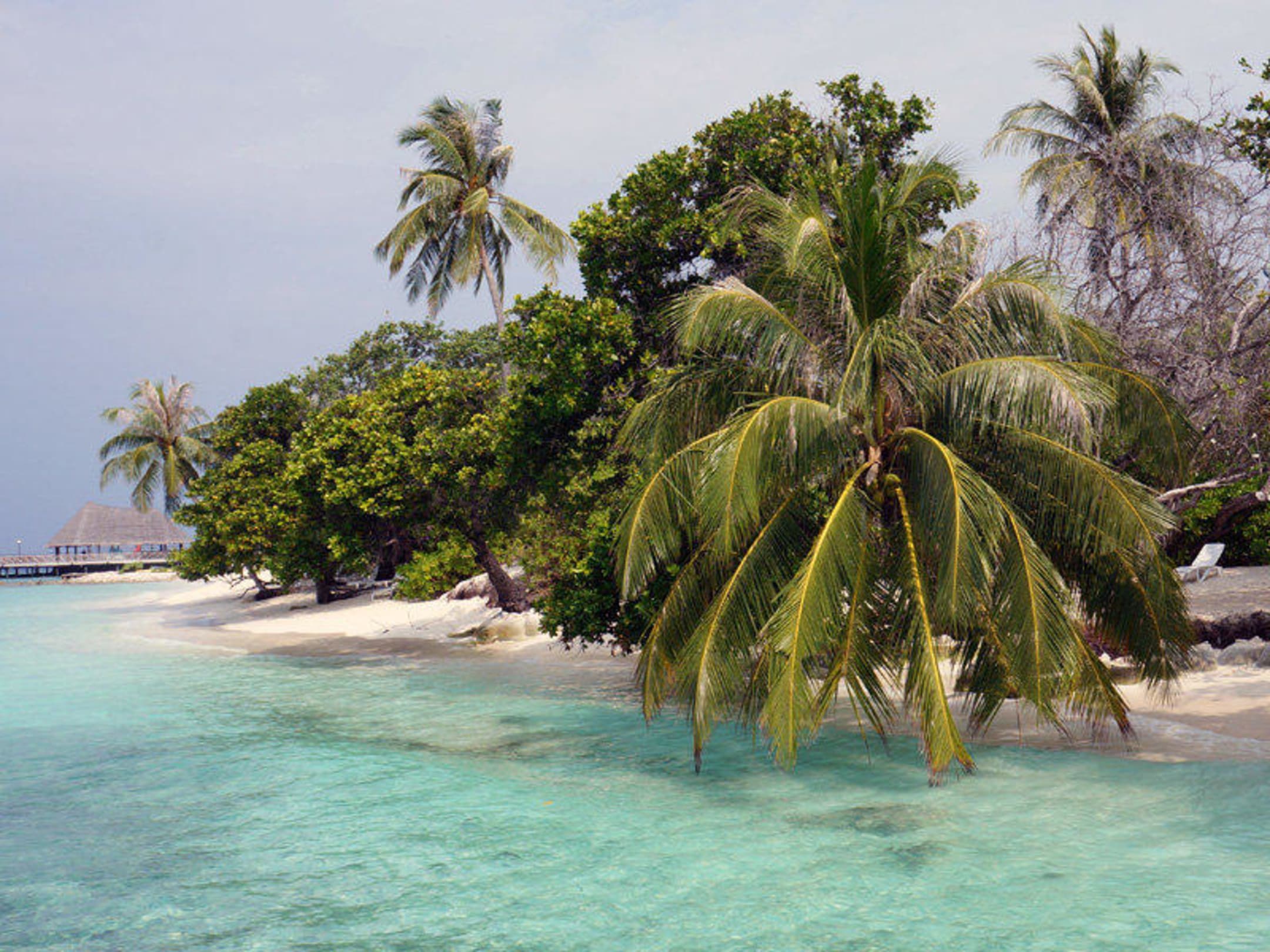 Strand mit schöner Palme, aufgenommen vom Wasserbungalow her