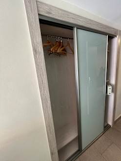 Kleiner Schrank, man kann Kleiderbügel nur schräg anhängen. Tresor ist vorhanden