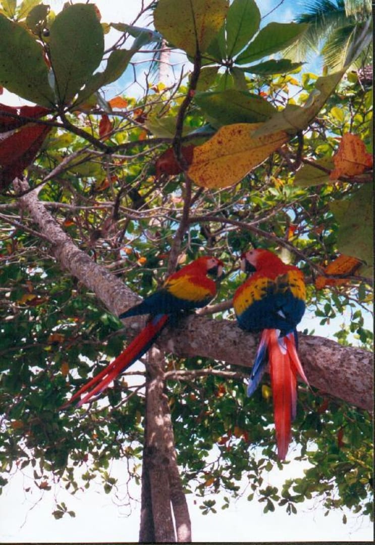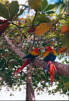 hellrote Aras im Hotelgarten