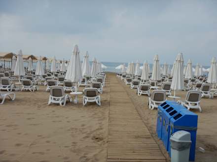 Der Strand mit reichlich Liegen und Schirmen