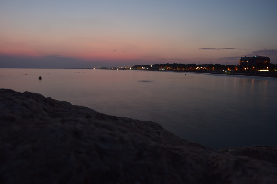 Blick auf den Strand während der blauen Stunde.