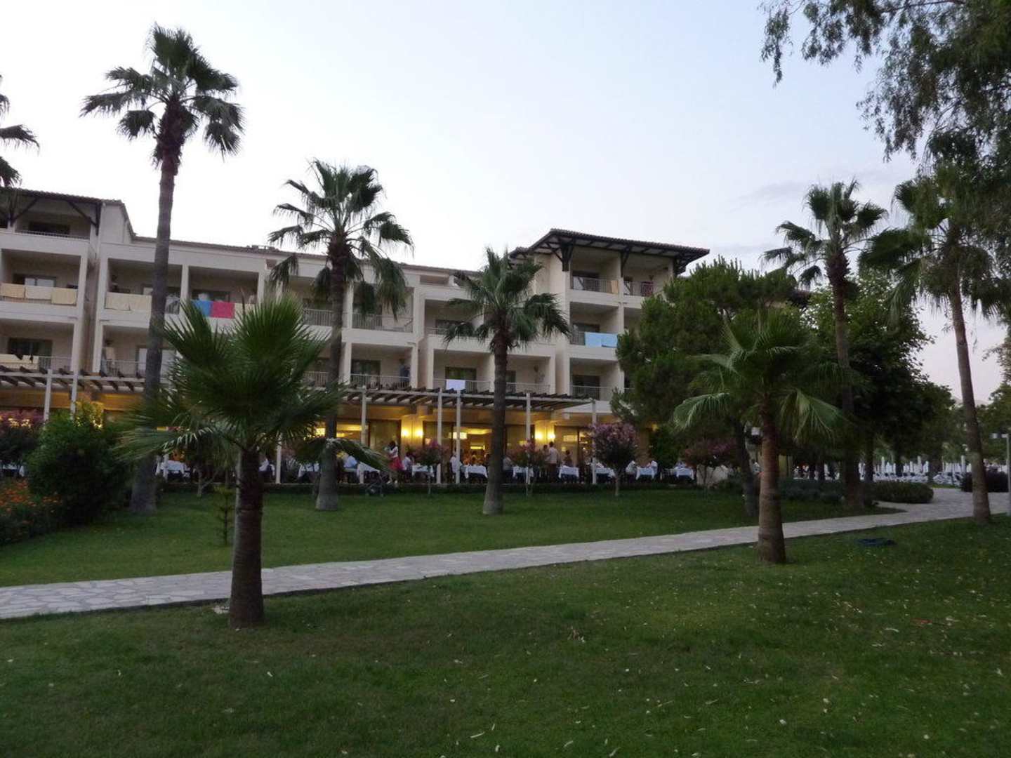 Es besteht die Möglichkeit im Freien zu speisen. Obendrüber ein kleiner Teil der Zimmer der Hotelanlage.