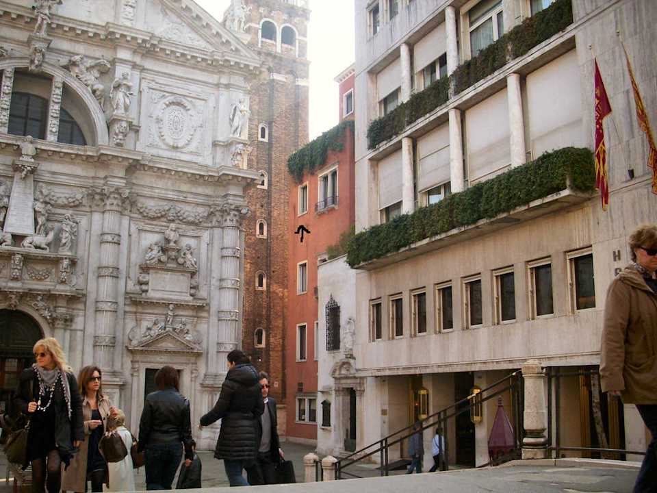 mit Eingang und links die Kirche (die übrigens schön ist)