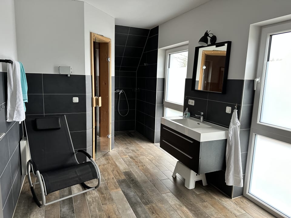 Badezimmer mit Sauna, Wanne Dusche und WC
