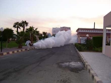 Versprühen von Insektengift Der Storch in der Anlage hat dann die getöteten Heuschrecken gefressen und ist verendet,