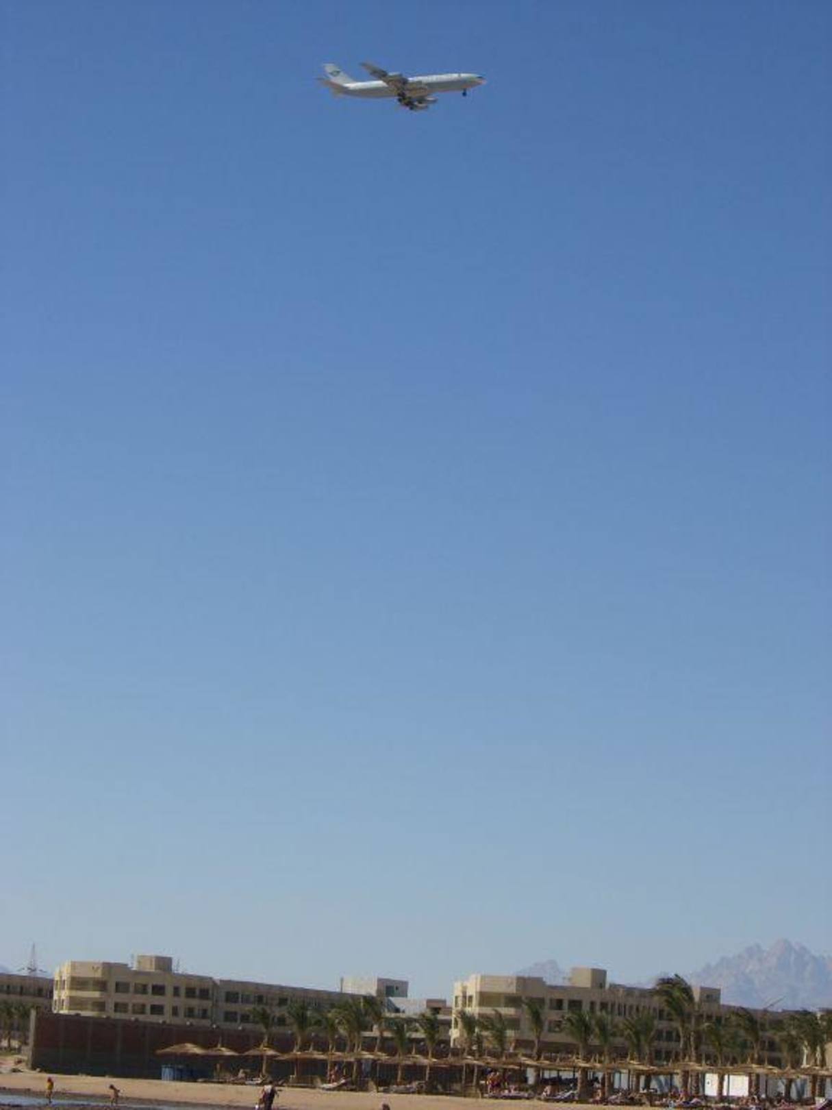 Landendes Flugzeug über dem Hotelstrand