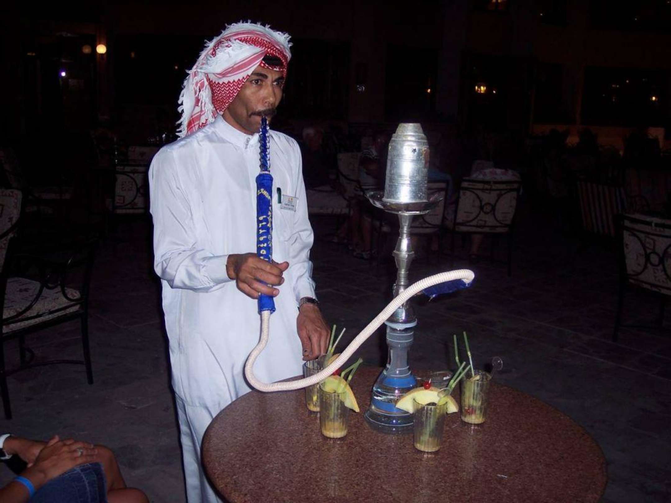 Wasserpfeife rauchenWasserpfeife rauchen war oft angesagt und bei dem Herrn auf dem Bild konnte man diese auch bestellen.