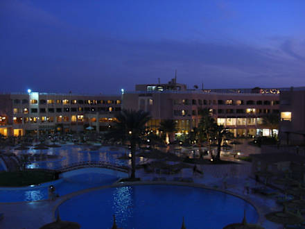 Blick vom Balkon auf die Anlage, am Abend