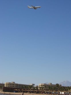 Landendes Flugzeug über dem Hotelstrand