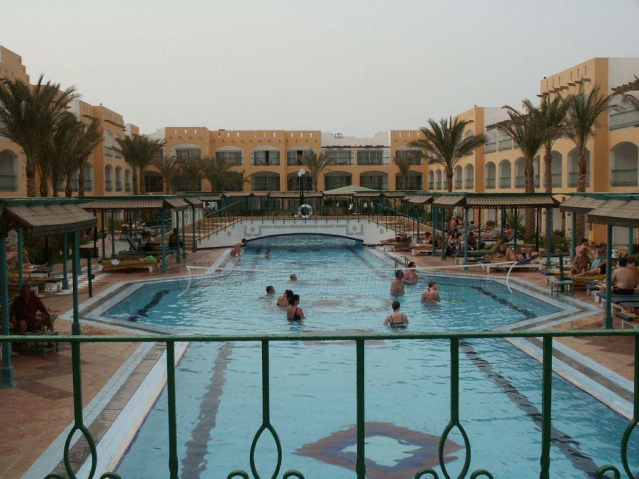 Poolanlage und ein Teil des Hotels von einer der Poolbrücken aus.