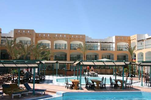 Blick auf den Kinderpool, die Poolbar (rechts) und das Buffet