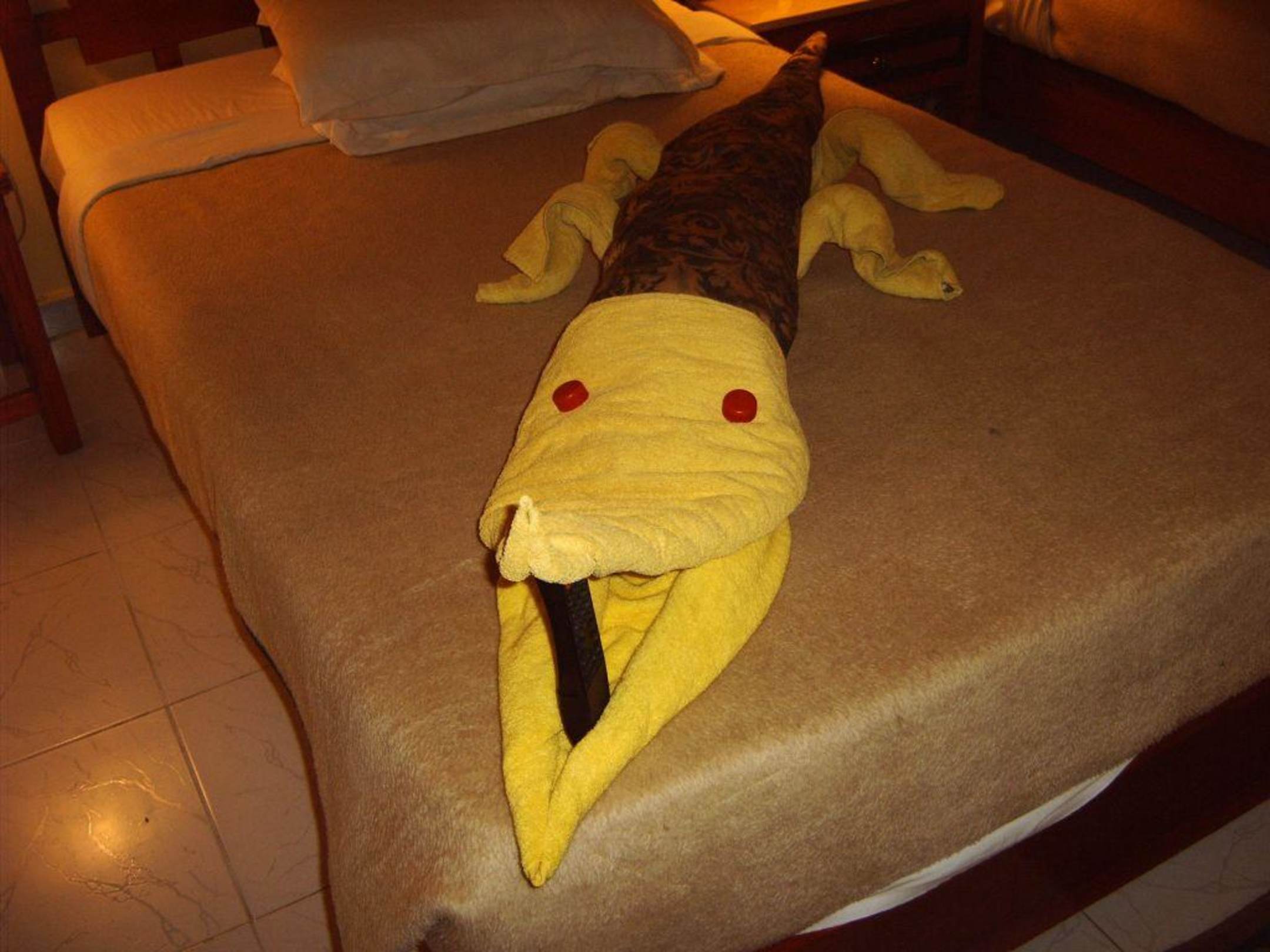 Unsere "Reinigungskräfte" haben uns mit einem Krokodil aus Handtüchern und Decken am Abend, als wir von Strand gekommen sind ein bisschen erschreckt =)