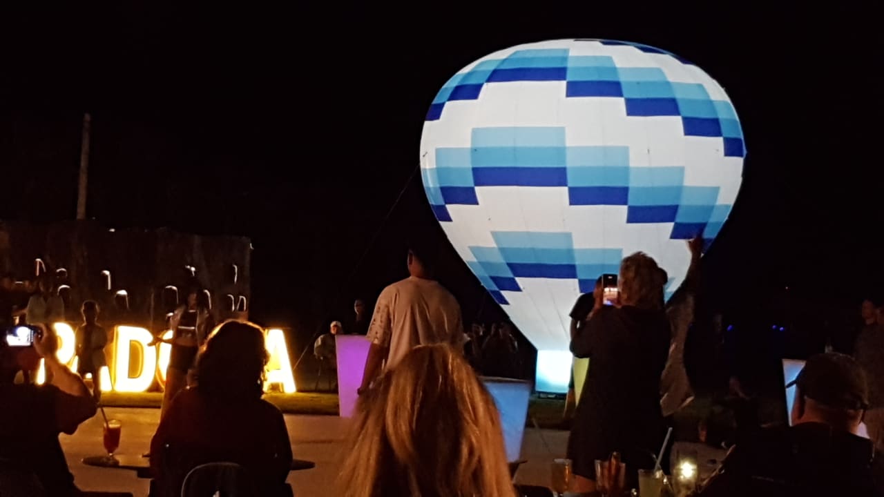 Abendunterhaltung am Strand mit Feuerschlucker und Feuerwerk