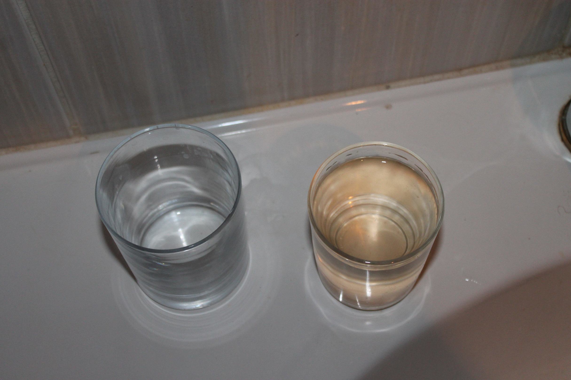 Des öfteren kommt auch mal solch eine Zusammensetzung aus dem Wasserhahn. Links ist Wasser aus der Flasche. Unabdingbar beim Zähneputzen !