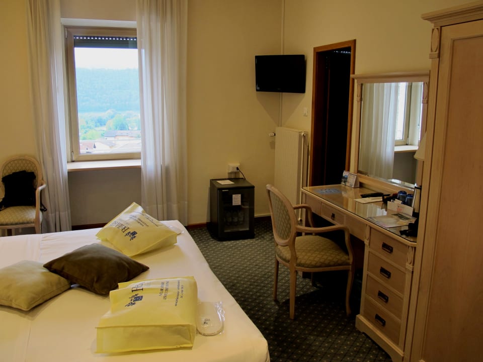 Zimmer mit Minibar am Boden.