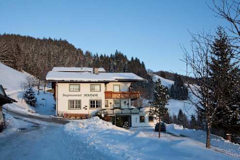 BergbauernhofVorderansicht des Hofes mit den Fremdenzimmern. Links unten sieht man die Zufahrt zu den überdachten Garagen, was gesonders im Winter angenehm ist. Man sieht das Heck des ersten Autos. Die Garagen sind auch in der Hauptsaison ausreichend