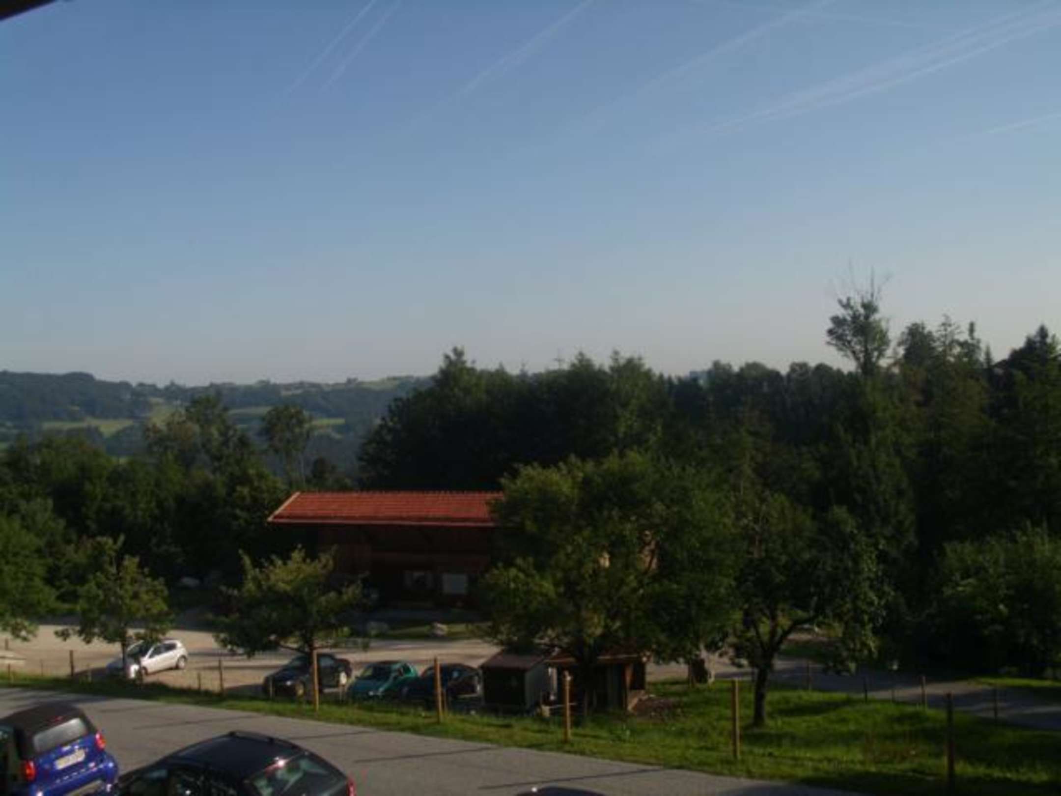 Blick aus dem Nebengebäude auf den Parkplatz