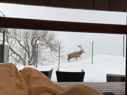 Blick vom Ruhebereich auf das Hirschgehege