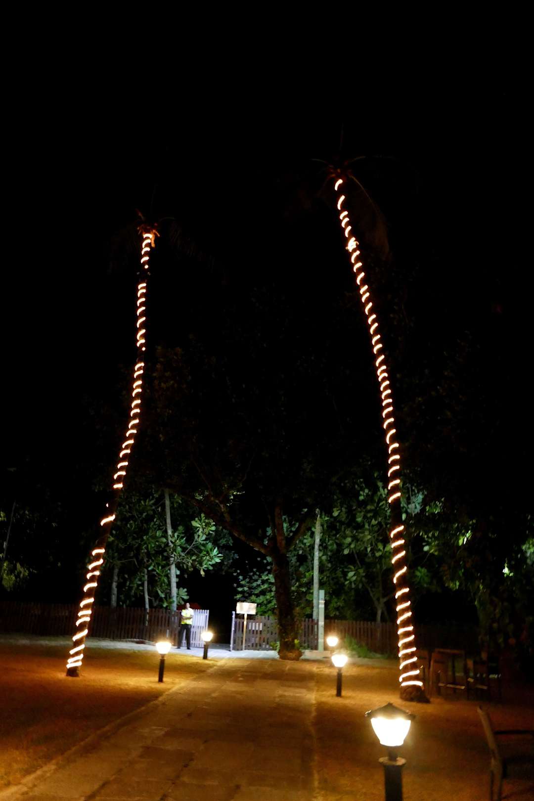 Beleuchtete Palmen am Ausgang zum Strand