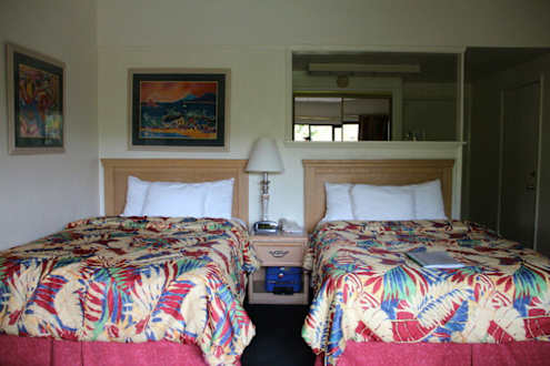 zwei relativ schmale (ca. 1,20m) aber bequeme Doppelbetten im Standardzimmer