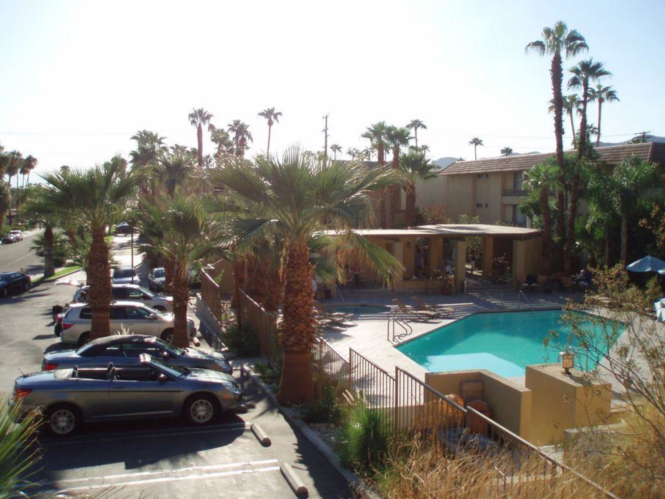 Pool und Parkplatz, hinter mir nur die Berge