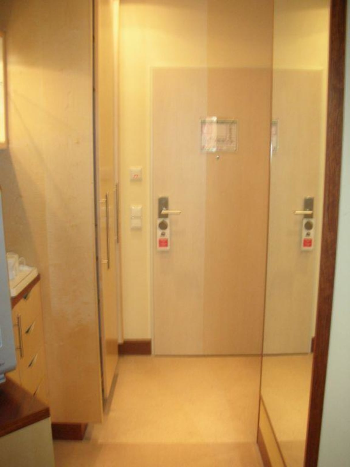 Zu sehen ist die Zimmertür. Links ist der Kleiderschrank und rechts die Garderobe